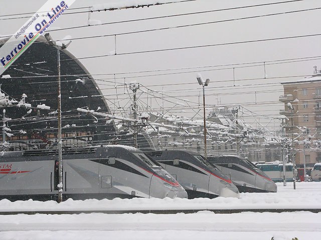 Tre ETR.500 affiancati, in arrivo ed in partenza (Foto Guido Catasta, 07 gennaio 2009)