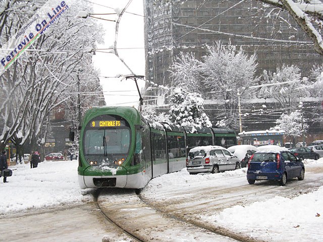 Ci si sposta all'esterno della stazione. Il maggiore problema per la circolazione tranviaria deriva dal funzionamento degli scambi. In via Fabio Filzi il tranviere tenta con grande difficoltà di girare l'ago di uno scambio per proseguire la corsa. (Foto Guido Catasta, 07 gennaio 2009)