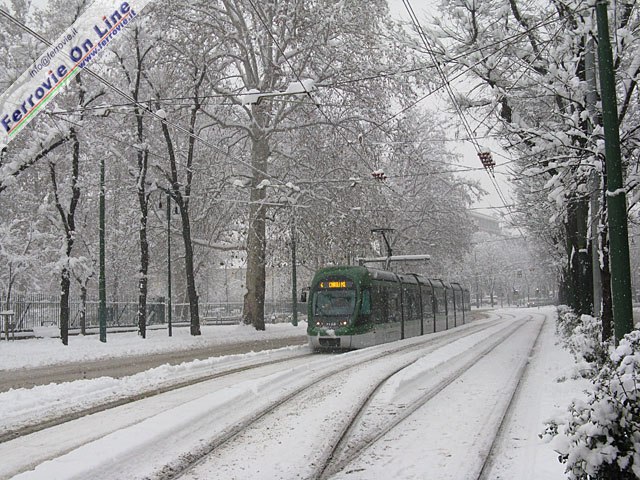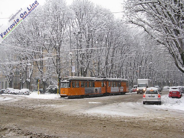 Il tram 7128 della linea 4 diretto a piazza Cairoli percorre il tratto a tre binari realizzato per velocizzare l'attraversamento in senso opposto dell'incrocio con piazza Lega Lombarda che si vede sullo sfondo. In questi minuti la precipitazione nevosa raggiunge il massimo dell'intensità, ma subito dopo cessa ed incomincia a piovere debolmente. (Foto Guido Catasta, 07 gennaio 2009)
