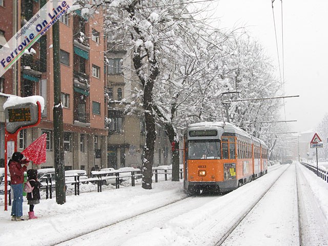 All'ora dell'uscita dalle scuole nevica ancora. Il tram 4833 della linea 12 in arrivo alla fermata in sede protetta di via Legnano. (Foto Guido Catasta, 07 gennaio 2009)