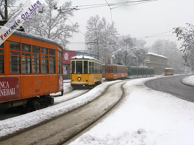 Il blocco di uno scambio provoca una lunga fila di tram in via Luigi Nono all'incrocio con piazzale Cimitero Monumentale (Foto Guido Catasta, 09 gennaio 2009)
