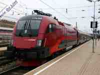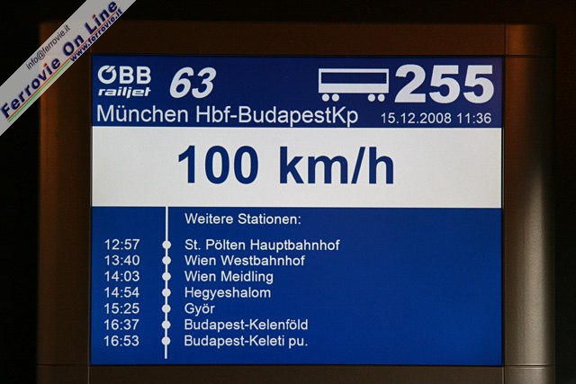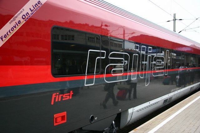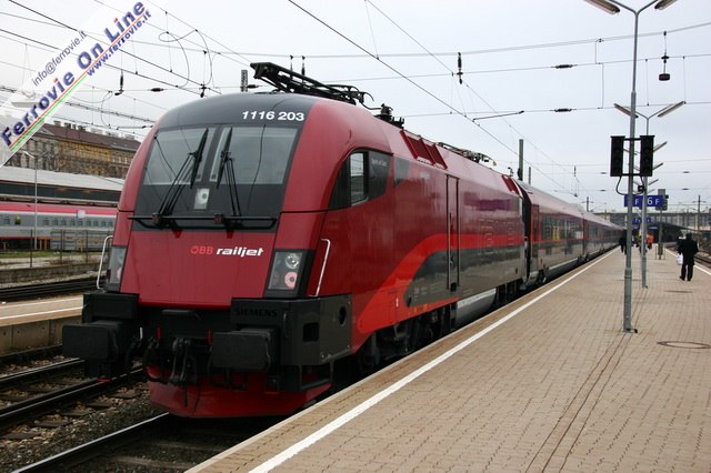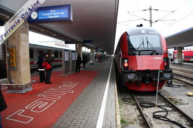 Nuovo fiammante, il Railjet in doppia composizione fa il suo ingresso in stazione. In testa la vettura pilota "Spirit of Vienna" con il suo convoglio, accoppiato allo "Spirit of Budapest": tutte le pilota e i locomotori Taurus destinati a questo servizio sono stati battezzati con tale dicitura, che riporta i nomi delle città toccate dal servizio. Un'usanza piacevole già vista anche sui treni ICE di DB o ICN di SBB, battezzati individualmente con nomi di città o personaggi illustri, che certo non stonerebbe anche sui nostri treni di punta.