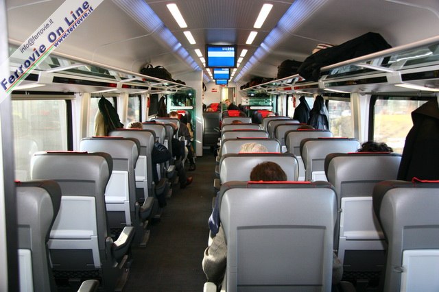 Ben più affollata è la First Class che conta pochissimi posti liberi. Si torna alla disposizione a salone con corridoio centrale e purtroppo non mancano alcuni posti con visuale non completa sui finestrini. Questo è il prezzo da pagare per avere più posti a sedere. La terza carrozza è occupata dall'infopoint per l'assistenza ai passeggeri, altri 10 posti di First Class e dal bistro, con un ampio banco e alcuni posti a sedere per le consumazioni.