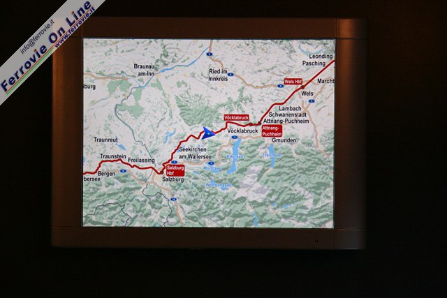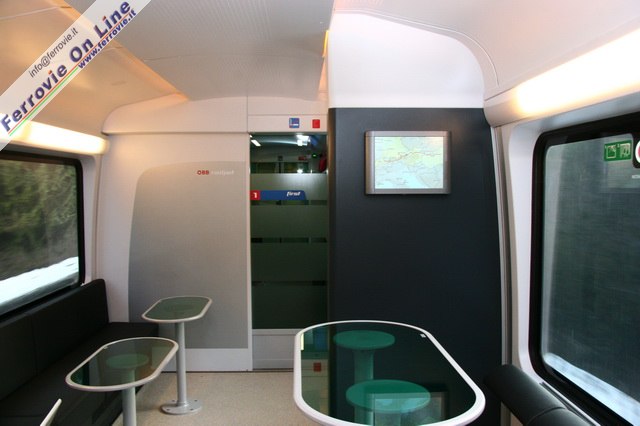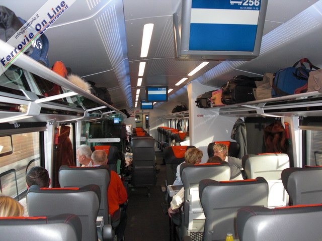L'affollamento a bordo è notevole e nel corridoio centrale per qualche minuto regna sovrana la confusione, con i numerosi passeggeri alle prese con ingombranti bagaglio al seguito, in affannosa ricerca del proprio posto. Nel migliore stile austriaco, in pochi minuti torna l'ordine nella carrozza: sono scomparsi i bagagli, alloggiati negli appositi spazi e tutti i passeggeri sono seduti ai loro posti! Tranne una comitiva di vocianti tedeschi che riesce ad essere più rumorosa di un gruppo di giornalisti italiani...!