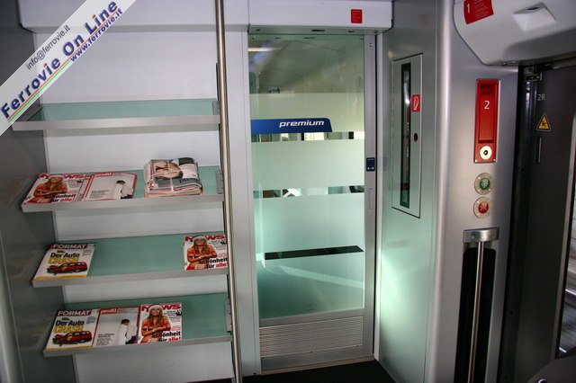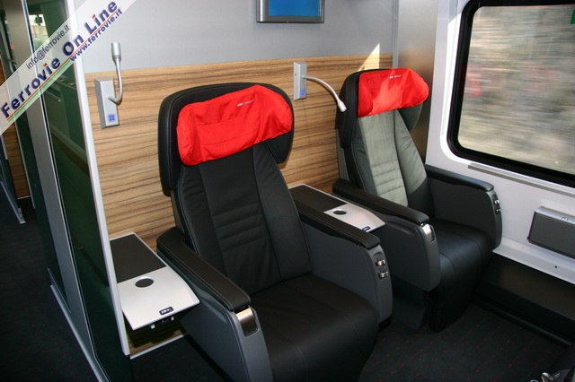 Qualche minuto dopo la partenza, mentre il treno guadagna velocità è ora di visitare il convoglio. Incominciamo dalla testa del treno, dalla classe Premium. L'intera carrozza è occupata da un solo viaggiatore, che per nulla disturbato dal nostro passaggio consuma al posto una tardiva colazione completa di tutto punto. 4 posti a sedere di estremità sono divisi dal corridoio centrale, mentre gli altri 12 sono raggruppati in tre scompartimenti ottenuti con paretine in cristallo. Tutti dispongono di confortevoli poltrone con ampia seduta ed allungo per le gambe, tavolino, spot di lettura con braccio flessibile e naturalmente presa di corrente (disponibile al posto in tutte le classi).