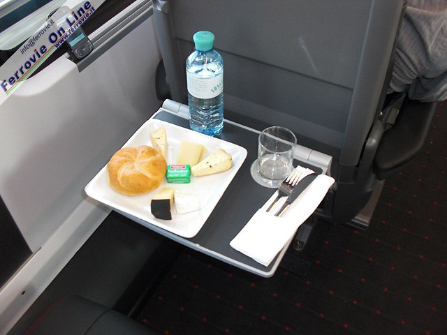 Il personale di bordo distribuisce i menù ai passeggeri che sono interessati al pranzo, raccogliendo immediatamente dopo le comande. Pochi minuti di attesa e dalla vicina carrozza bistro arrivano le bevande servite in bicchieri di vetro, seguite a breve distanza dai piatti ordinati, serviti in piatti di ceramica e con posate in acciaio. La cucina si basa su pietanze precotte, con menù tipico di queste parti: difficile trovare "lo spaghetto alle vongole veraci" come è successo al sottoscritto su un Cisalpino in servizio sul San Gottardo, ma comunque un misto di formaggi ed un tipico würstel soddisfano l'appetito di molti del gruppo.