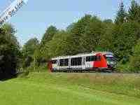 5. Lungo la valle del Gail si snoda una tranquilla ferrovia a binario unico non elettrificata che ha termine a Kötschach-Mauthen. La linea ha origine ad Arnoldstein, sulla direttrice Venezia - Vienna. Da qualche tempo vi prestano servizio anche moderni convogli Diesel del gruppo 5022, come quello nell'immagine, impegnato in servizio Regionale con il treno 4810 Kötschach-Mauthen - Villach HBF, immerso nel verde paesaggio tra St. Daniel e Dellach im Gailtal. (Foto Fabio Veronesi, 19 agosto 2008)