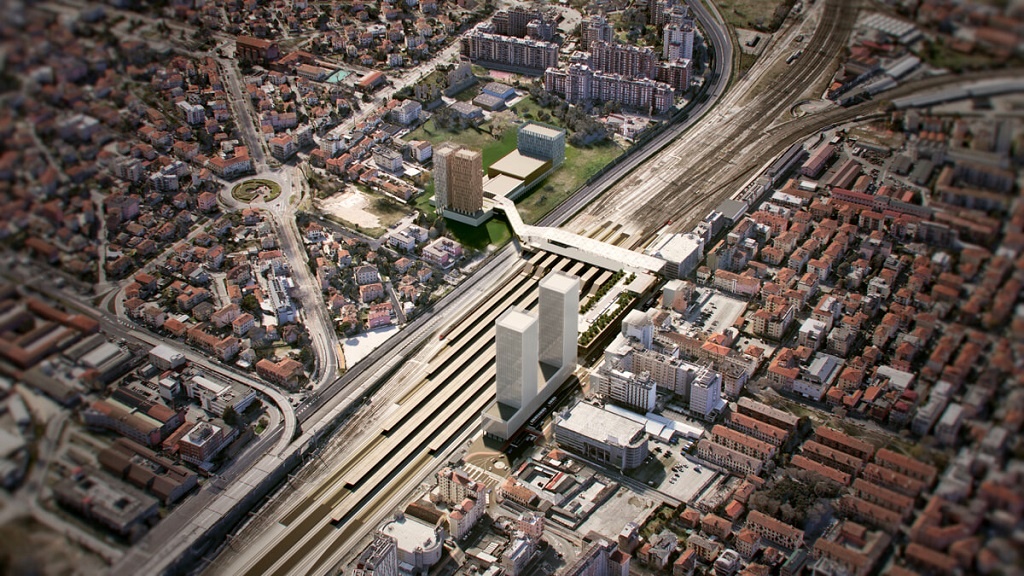 A ovest, dove si trova l'attuale parcheggio multipiano, il progetto prevede la creazione di un importante snodo di connessione tra le varie parti dell'intervento; conseguentemente l'angolo viene caratterizzato come "porta urbana" sia verso la stazione che verso il collegamento urbano. Il nodo viene caratterizzato funzionalmente mediante la realizzazione di una scala, affiancata da una torre con due ascensori.