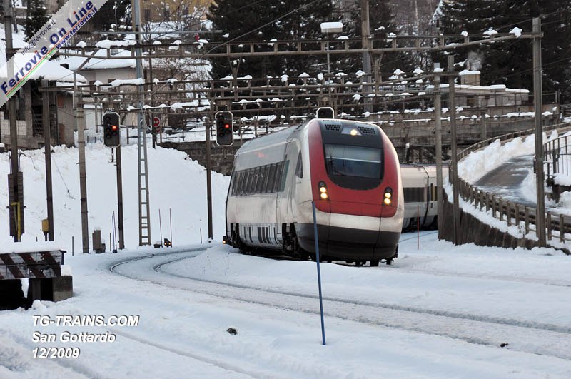 Segue un ETR.470 Cisalpino, che transita nella stazione di Airolo, prima di lanciarsi nella discesa verso Zurigo. (Foto Tg-Trains.com, 2 dicembre 2009)