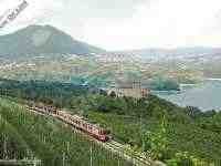 MEZZOLOMBARDO - Una coppia di elettrotreni ETi 8/8 "Orsetto" espleta il treno n°6 da Trento per Marilleva, in arrivo nella stazione di Mezzolombardo, attraversando la "Piana Rotaliana", zona ricca di vigneti con la cui uva viene prodotto il famoso vino "Teroldego", illuminata dai primi raggi di sole della giornata. (Foto Emiliano Maldini, 09 luglio 2010)