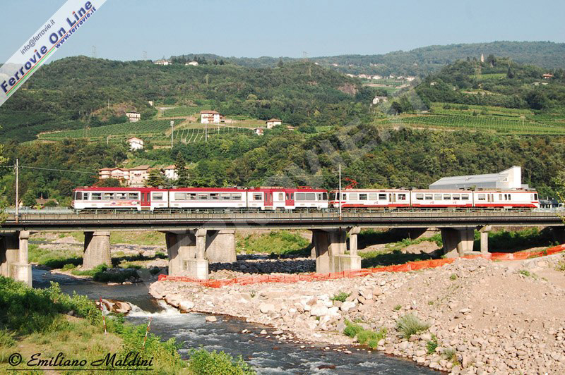 LAVIS - Gli elettrotreni ET 15 ed ET 16, diretti a Trento, stanno attraversando il ponte sul torrente Avisio, dopo aver effettuato la fermata a Lavis, nel tardo pomeriggio di Venerdì 9 Luglio 2010. (Foto Emiliano Maldini, 09 luglio 2010)
