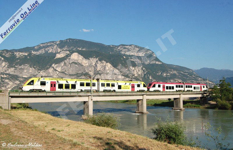 GRUMO SAN MICHELE - L'ETi 408, in livrea commemorativa per i mondiali di Mountain Bike, assieme ad un altro ETi, hanno da poco lasciato la stazione di Grumo San Michele ed attraversano il fiume Adige, dirigendosi verso Trento. (Foto Emiliano Maldini, 10 luglio 2009)