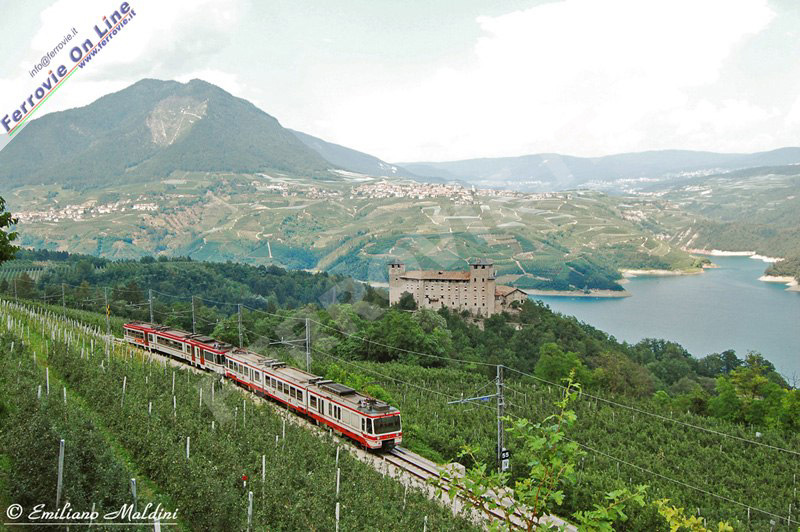 CLES - Castel Cles ed il lago di Santa Giustina fanno da quinta al transito della coppia di elettrotreni ET 15 ed ET 16, diretti a Marilleva, come treno n°22, che tra pochi istanti effettuerà fermata nella stazione di Cles. (Foto Emiliano Maldini, 10 luglio 2009)