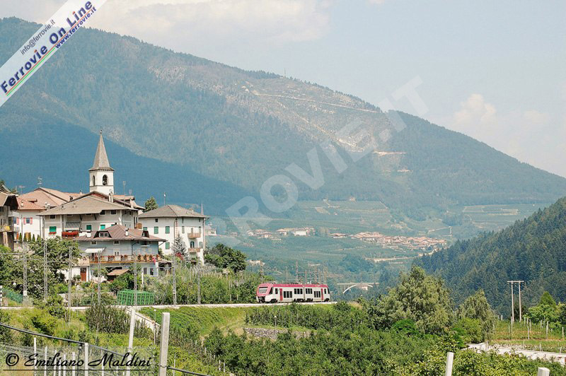 BOZZANA - BORDIANA - Dopo aver fermato nella stazione di Bozzana - Bordiana, l'ETi 407 del treno n°25 da Marilleva per Trento, transita sotto un gruppetto di case e la parrocchia della frazione di Bozzana. Sullo sfondo si può notare il viadotto di Mostizzolo, che il treno in fotografia percorrerà dopo pochi minuti. Il viadotto di Mostizzolo è, dopo quello di Santa Giustina, il secondo ponte più alto della linea. (Foto Emiliano Maldini, 10 luglio 2010)