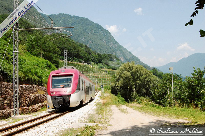 DENNO - Dopo Mezzolombardo, la linea si sviluppa attraverso un paesaggio più aspro e spettacolare, il treno n° 40 da Trento per Marilleva, effettua una breve fermata nella piccola stazione di Denno dove possiamo ammirare l'elettrotreno ET 16 nella nuova livrea ispirata agli ETi 8/8, accoppiato all'ET 15, ancora in livrea originaria. (Foto Emiliano Maldini, 09 luglio 2010)