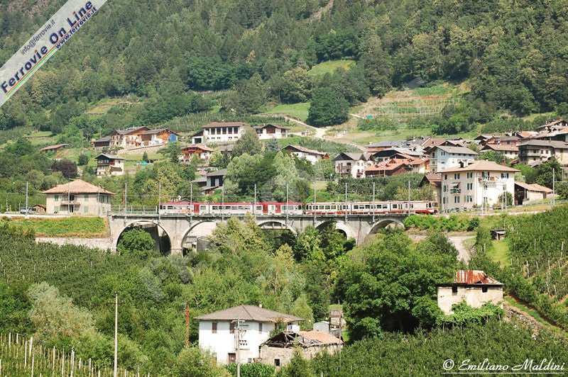 MALE' - Poco prima della stazione di Malè, la linea attraversa il torrente Rabbies con un ponte ad archi ed in curva. Su questo ponte vediamo transitare gli elettrotreni ET 15 + ET 16 appena partiti da Malè e diretti a Trento come treno n°15. (Foto Emiliano Maldini, 10 luglio 2010)