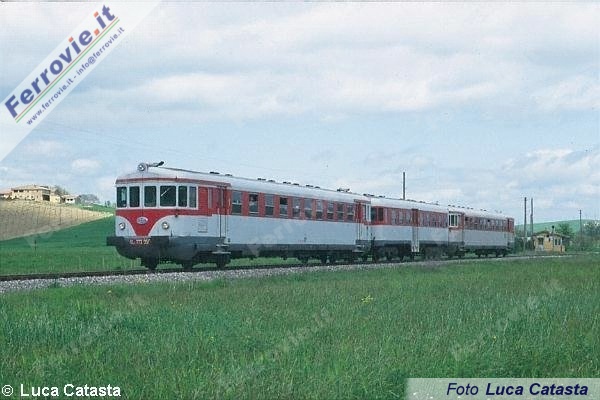 Dopo un'ultima sosta presso la caratteristica fermata di Trequanda, siamo nuovamente giunti ad Asciano, ove abbiamo incrociato l'altro convoglio del Treno Natura, composto dalle ALn 773.3504 e 3505 inquadranti la Ln 664.3507, tutte in livrea d'origine rosso-panna.