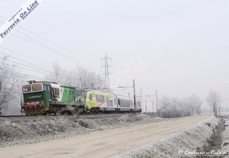 La DE.520.14 FM, al traino dell'ATR.220.024 LN in trasferimento da Iseo a Milano Certosa, ripresa in corsa presso Romano, con la campagna Bergamasca imbiancata dalla galaverna. (Foto Emiliano Maldini, 15 dicembre 2010)