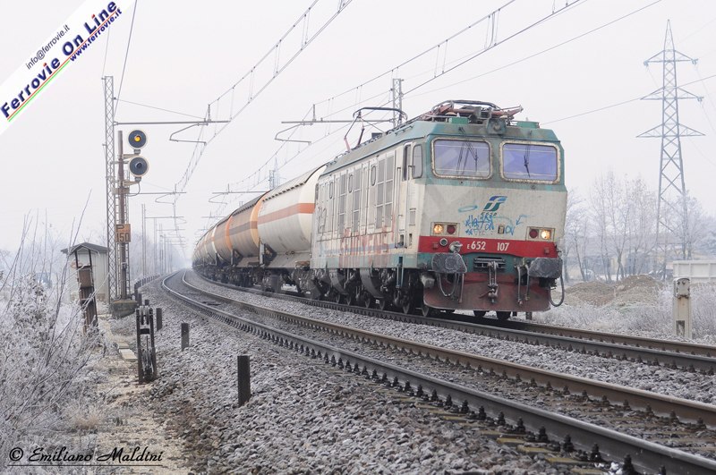 La E.652.107, con i segni del rigore invernale, traina un pesante treno di cisterne di gas, proveniente da Modane e diretto a Domegliara, qui fotografato in transito nei pressi di Romano a metà mattinata...quando la temperatura esterna era ancora a -10°C! (Foto Emiliano Maldini, 15 dicembre 2010)