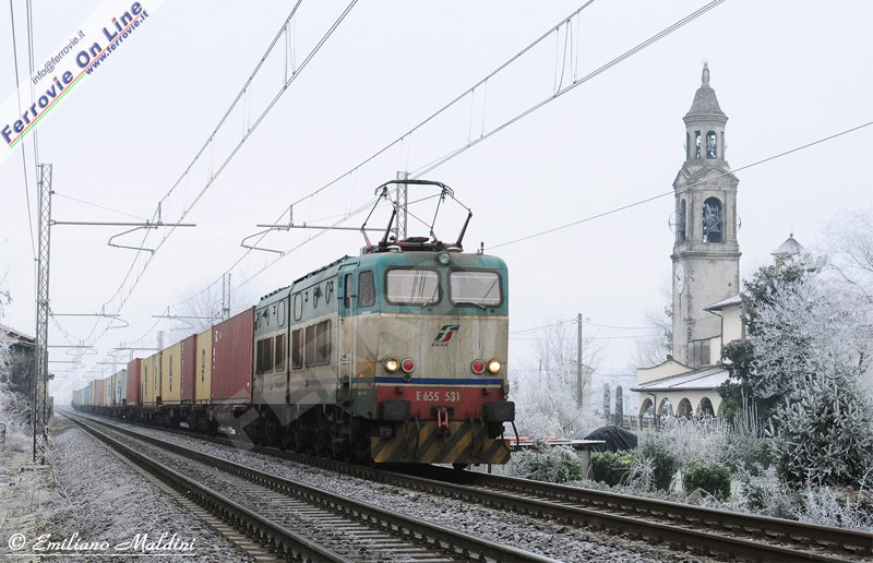 Facciamo ora un salto indietro di qualche anno...siamo nel Gennaio 2006 e vediamo transitare, sotto una fitta nevicata, un treno merci proveniente da Milano Smistamento e diretto a Brescia Scalo. Ci troviamo nei pressi di Romano, con la E.655.268 titolare, allora assegnata al Deposito Locomotive di La Spezia. (Foto Emiliano Maldini, gennaio 2006)