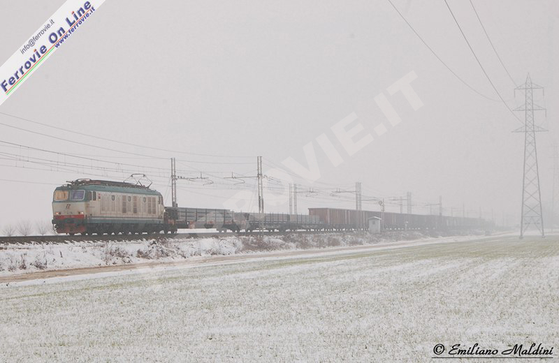 Il silenzio della campagna Bergamasca imbiancata da una leggera nevicata è interrotto dal transito di questo treno merci, trainato da una E.652 e diretto a Brescia Scalo. (Foto Emiliano Maldini, 30 gennaio 2010)
