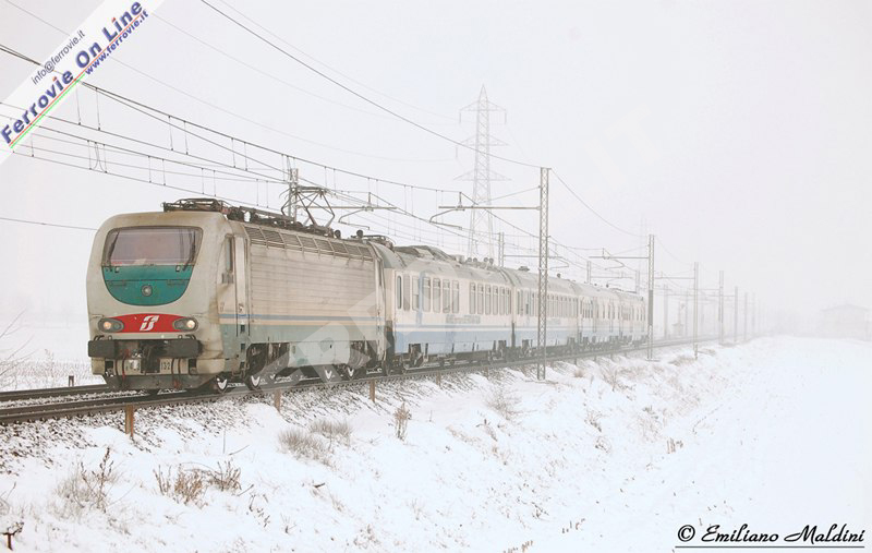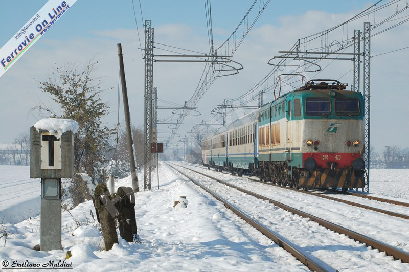 Le tre carrozze tipo UIC X di questo treno regionale Alessandria - Piacenza non sono certo un peso per la E.656.420, fotografata tra le stazioni di Sarmato e Rottofreno, dopo una copiosa nevicata. (Foto Emiliano Maldini, 29 novembre 2008)