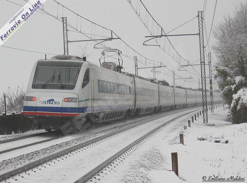 Sotto una leggera nevicata, transita nei pressi di Romano questo ETR.470 Cisalpino diretto a Domodossola, nel Gennaio 2008. (Foto Emiliano Maldini, gennaio 2008)