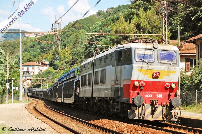 Piano Orizzontale dei Giovi (GE) - Da Torino, percorrendo la linea dei Giovi, raggiungiamo Genova. Su questa tortuosa linea, che vede pendenze del 35 per mille nel tratto tra Genova e Busalla, incontriamo la E.655.540 in testa ad un treno composto da carri porta auto vuoti, diretti a Savona Parco Doria, in transito a Piano Orizzontale dei Giovi, nel settembre 2010. (Foto Emiliano Maldini, settembre 2010)