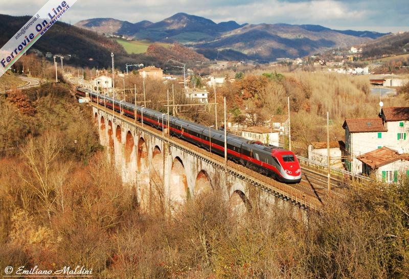 Grizzana Morandi (BO) - Un ETR.500 FRECCIAROSSA, diretto a Roma Termini, transita sul noto viadotto di Grizzana Morandi il 5 Dicembre 2009. A partire dalla settimana successiva tutti gli ES* in servizio tra Bologna e Firenze percorreranno la nuova linea AV/AC, abbandonando così la linea storica via Prato. (Foto Emiliano Maldini, 5 dicembre 2009)
