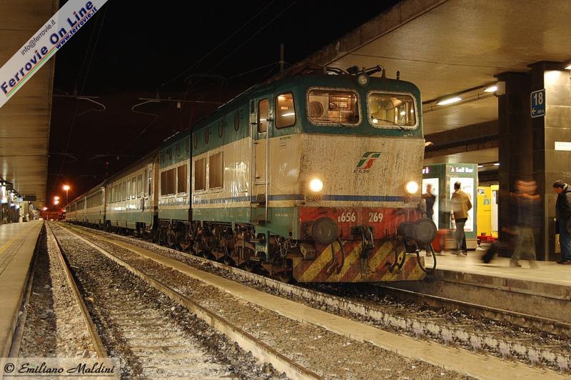 Roma Termini - Un treno IC proveniente dal Sud giunge a Roma Termini in una serata di ottobre 2009, trainato dalla E.656.269. (Foto Emiliano Maldini, ottobre 2009)