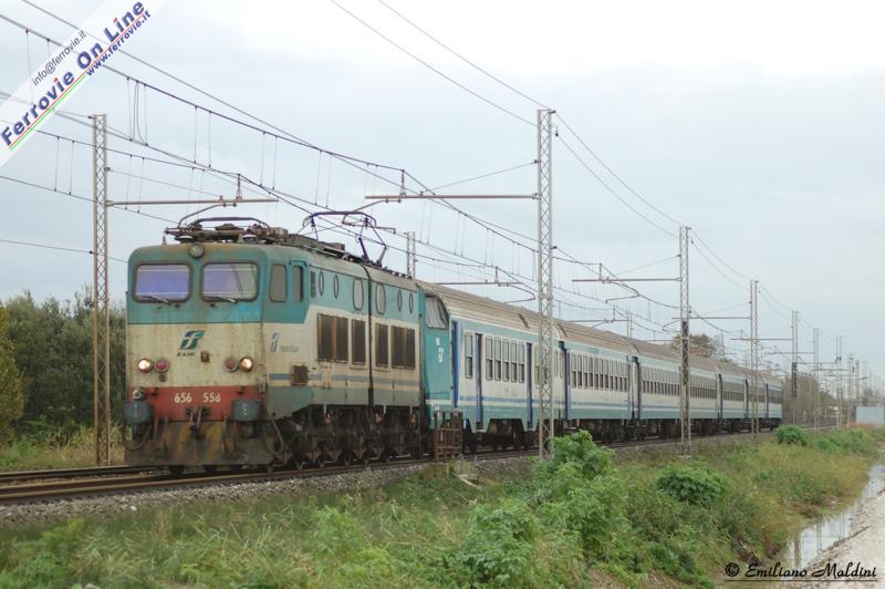 Migliarino Pisano (PI) - Dopo aver risalito la costa tirrenica, in un grigio pomeriggio del novembre 2008 assistiamo al transito, presso Migliarino Pisano, di questo treno Regionale da Pisa Centrale per Genova Piazza Principe, con la E.656.558 posta in testa e, subito dietro, la carrozza pilota. (Foto Emiliano Maldini, novembre 2008)