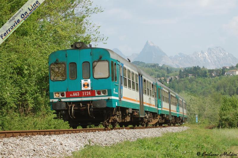 Fivizzano-Rometta-Soliera (MS) - I monti Pisanino e Pizzo d'Uccello, facenti parte della catena delle della Alpi Apuane, dominano la scena nei pressi di Fivizzano-Rometta-Soliera, dove è stata ripresa questa tripla di ALn 663 che assicura un treno Regionale da Aulla per Lucca. (Foto Emiliano Maldini, maggio 2009)