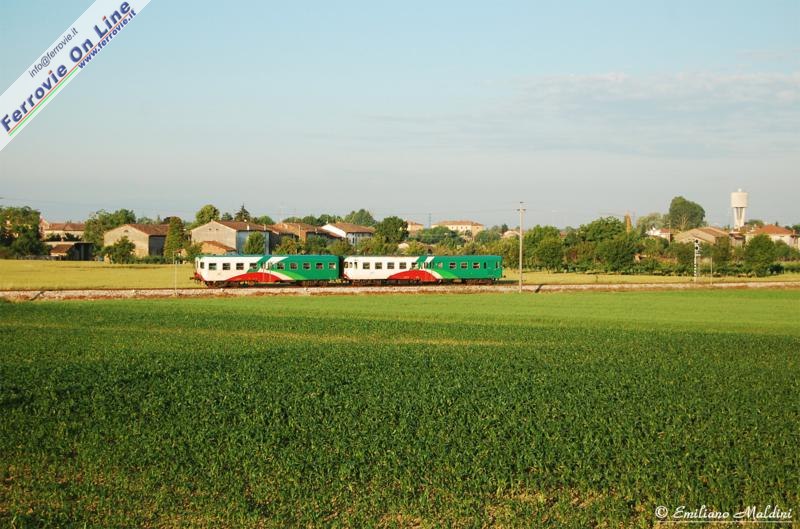 Boretto (RE) - La quiete della campagna emiliana è rotta per un istante dal rumore del transito di questa ALn 668 e della sua rimorchiata, dirette a Brescello, qui riprese in arrivo a Boretto con la calda luce dell'alba di una calda mattina del giugno 2010. (Foto Emiliano Maldini, giugno 2010)