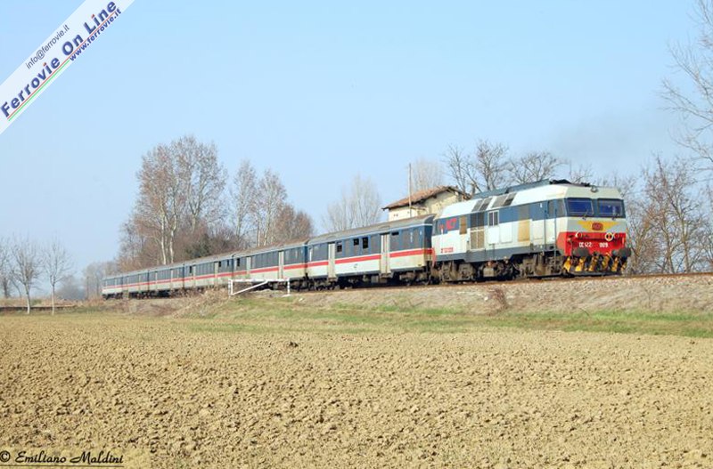 Fogliano (RE) - In un freddo e terso pomeriggio del febbraio 2009, il "treno degli studenti" della linea ACT (ora FER) Sassuolo - Reggio Emilia, con la DE 122.009 in spinta alle consuete 6 carrozze ex-SBB, transita nei pressi di Fogliano, diretto a Reggio Emilia. (Foto Emiliano Maldini, Febbraio 200)