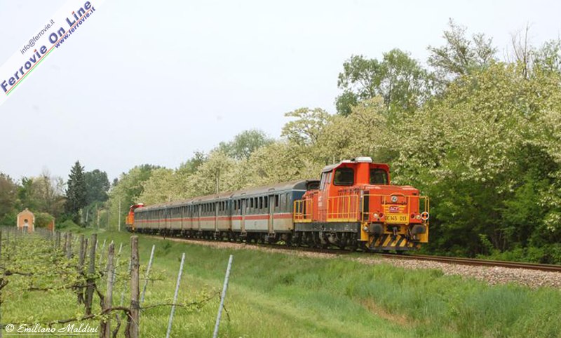Fogliano (RE) - Nel maggio 2009 il "treno degli studenti" della linea ACT Sassuolo - Reggio Emilia venne effettuato per qualche giorno in doppia trazione simmetrica di locomotive DE 145, al posto della usuale composizione reversibile con carrozza pilota e locomotiva DE 122. In questa immagine vediamo l'insolito convoglio, diretto a Sassuolo, transitare nei pressi di Fogliano. (Foto Emiliano Maldini, Maggio 2009)