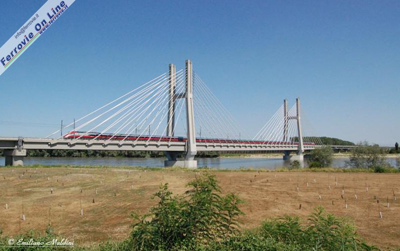 Piacenza - Sulla linea AV/AC Milano - Bologna, un ETR.500 FRECCIAROSSA transita sul ponte strallato sul Po, nei pressi di Piacenza, diretto a Roma Termini. (Foto Emiliano Maldini, Luglio 2009)