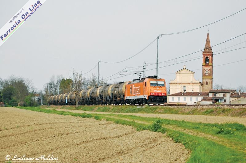 Castelvetro (PC) - Sulla Piacenza - Cremona, nei pressi di Castelvetro, troviamo la E.186.910 LI, dell'impresa ferroviaria Linea Smart Business Ways, impegnata con un treno di cisterne vuote dirette a Genova Voltri e proveniente da Cava Tigozzi, in un tardo pomeriggio dello scorso aprile. (Foto Emiliano Maldini, Aprile 2010)
