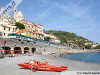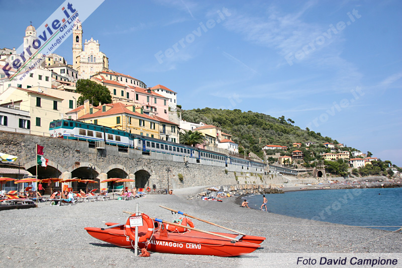 Forse nessuna riviera come quella Ligure ha un connubio così forte con il treno. La linea tra Genova e Ventimiglia attraversa tutte le prinicipali località balneari come Bordighera e Sanremo. Purtroppo molti tratti a semplice binario che correvano a ridosso della costa entrando nel cuore delle cittadine sono stati abbandonati a favore di veloci varianti interne. Resistono alcuni tratti, che nei prossimi anni verranno spostati a monte, come il tracciato che interessa Cervo, dove transita una E.656 impegnata con un treno per Ventimiglia, nell'inconfondibile scenario del borgo marinaro. (Foto David Campione, 13 settembre 2009)
