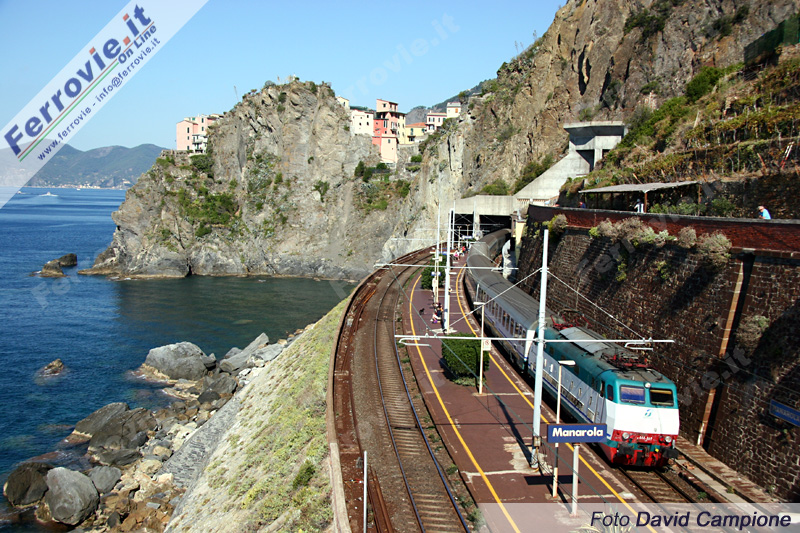 Sembrano tanti piccoli diorami. Parliamo dei paesini delle Cinque Terre, che si dividono con la ferrovia il poco spazio rimanente tra il mare e la montagna. Attraverso la Via dell'Amore è possibile ammirare scorci di rara bellezza, dove il treno e la ferrovia si inserisce armoniosamente nel paesaggio. Nella piccola stazione di Manarola la E.444.069 sfila veloce con un treno Intercity diretto a sud. (Foto David Campione, 28 settembre 2008)