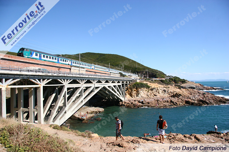 Un altro punto in cui i binari corrono in riva al mare della Toscana è presso Calafuria, dove la ferrovia è parallela alla SS1 Aurelia; qui la costa frastagliata ha imposto la realizzazione di importanti opere d'arte per binari e strada necessarie per scavalcare un'insenatura. (Foto David Campione, 06 settembre 2009)