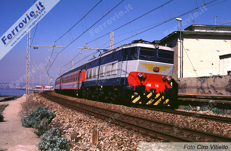 Anche in Campania, a dispetto dell'abbondante sviluppo costiero, non sono molti i tratti in cui mare e ferrovia convivono. La ferrovia in Italia nasce proprio in questa regione, con la tratta Napoli - Portici, che per diversi chilometri corre a pochi metri dal mare, prima di attestarsi al Granatello di Portici direttamente sul mare. Poco più a sud e quasi 160 anni dopo, una onnipresente E.656 lambisce il mare con un treno di carrozze per Medie Distanze a Torre del Greco. (Foto Ciro Vitiello, 07 aprile 1997)