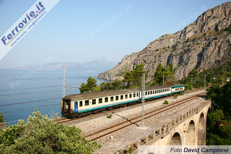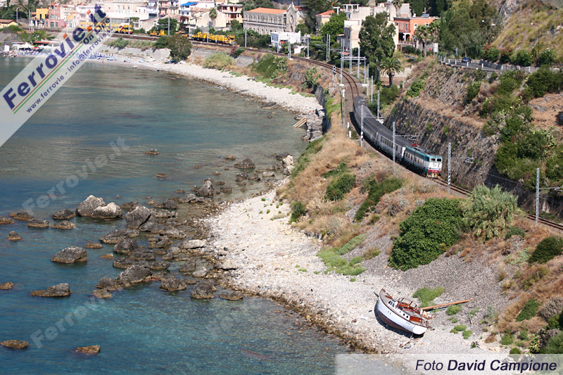 Il nostro viaggio attraverso le coste italiane è arrivato nella regione più meridionale, la Sicilia, isola che possiamo raggiungere comodamente seduti sul nostro treno imbarcato su una nave traghetto Bluvia. Il consiglio per i buongustai è ovviamente di scendere dai vagoni e provare i famosi arancini, che con il panorama che si ammira durante la traversata rendono unico il viaggio. Una volta sbarcati in Sicilia non mancano le bellezze naturali. Qui siamo a Capo Taormina sovrastato dall'omonima cittadina famosa in tutto il mondo per il Teatro Greco e dalla quale si gode un'incantevole vista sull'Etna. L'Intercity 722 da Siracusa per Roma Termini è da poco partito dalla stazione di Taormina. Prossima tappa Messina, dove verrà imbarcato su un traghetto per Villa San Giovanni e da qui proseguirà fino alla Capitale. (Foto David Campione, 31 luglio 2011)