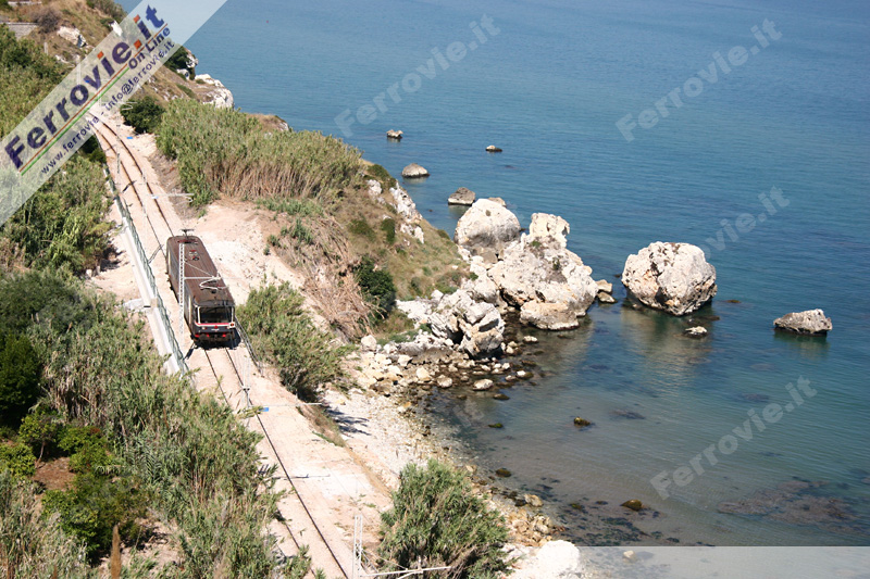 Arriviamo in Puglia, località meta di molti turisti in cerca di mare cristallino e bellezze artistiche. Salento e Gargano le mete più ambite. E qui siamo proprio sul Gargano, sui binari della Ferrovia Garganica che collega San Severo a Peschici-Calenelle, l'unica nella regione che sfiora il mare. Da Lido del Sole fino al capolinea il binario singolo viaggia lungo costa, in alcuni tratti dividendo perfino dal mare i villaggi turistici. In foto un treno per Peschici presso Rodi Garganico. (Foto David Campione, 17 luglio 2007)