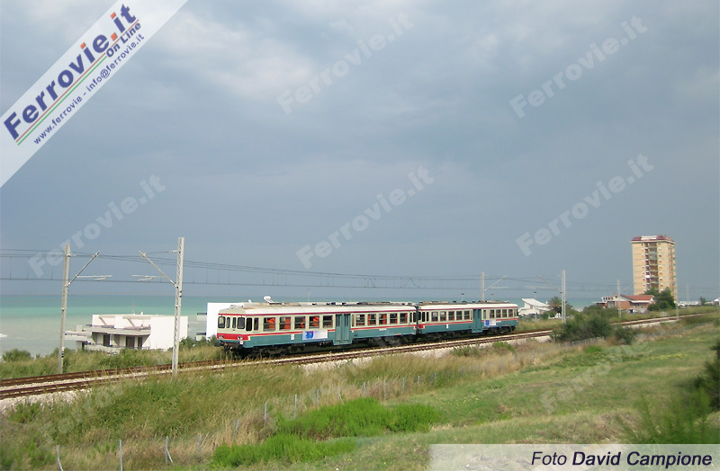 Il piccolo Molise, come la Basilicata, è caratterizzato da un esiguo sviluppo costiero. Ciò nonostante non mancano i punti in cui la ferrovia corre vicino al mare. Una coppia di automotrici ALn 776 della Ferrovia Adriatico Sangritana viaggia verso Termoli, sotto un cielo che non promette nulla di buono. (Foto David Campione, 14 settembre 2003)