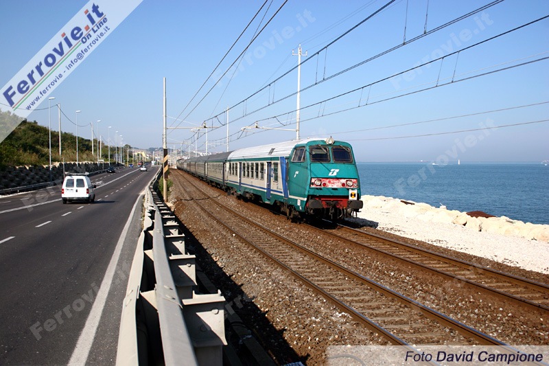 Qui siamo alle porte di Ancona, nelle Marche, con la ferrovia stretta per un lungo tratto tra il mare e la Strada Statale 16. In questa regione sono moltissimi i tratti in cui i binari sono vicini al mare, servendo così le più rinomate località di villeggiatura della costa marchigiana. (Foto David Campione, 30 settembre 2006)