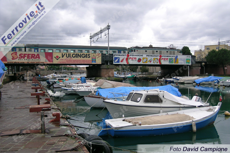 In Emilia-Romagna ferrovia e mare non sono in stretto contatto, nonostante diversi chilometri di sviluppo costiero. Un'occasione è data dal porto-canale di Rimini, dove è ripresa una E.632 in spinta ad un treno per Medie Distanze, nascosto dalle sponde del ponte in ferro. (Foto David Campione, 17 gennaio 2004)