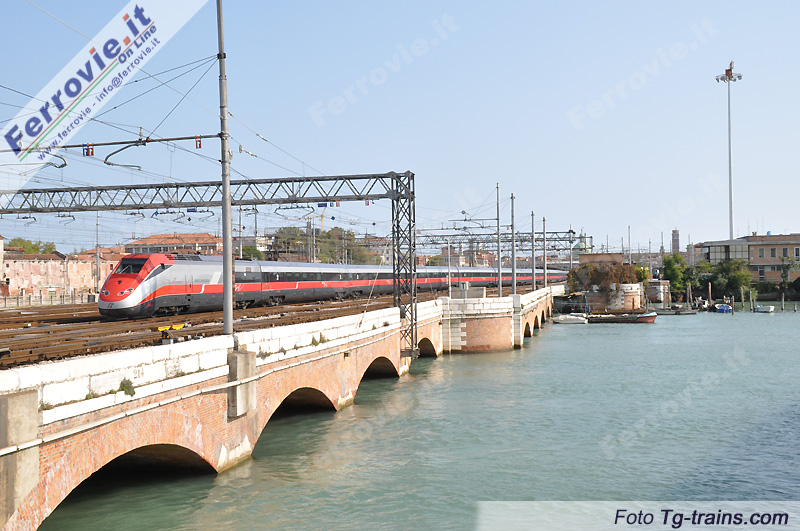 Siamo arrivati in Veneto. Il Ponte della Libertà è il biglietto da visita per chi arriva in auto o in treno a Venezia. Lungo quasi 4 km, collega Mestre alla città lagunare ed è una vera è propria passerella che vede sfilare sul mare centinaia di treni al giorno. In foto un ETR.500 Frecciarossa ha da poco lasciato la stazione di Venezia Santa Lucia e comincia la traversata del lungo Ponte. (Foto Tg-Trains.com, 04 ottobre 2008)