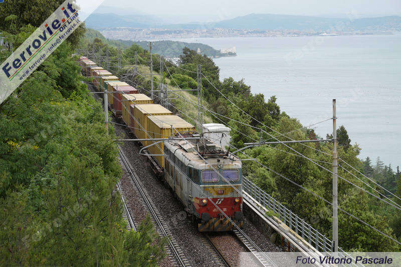 L'impervio territorio del Friuli-Venezia Giulia presso Santa Croce non lascia molto spazio alla ferrovia, costruita a ridosso della montagna. Il Castello di Miramare completa lo scenario della E.656.201 impegnata con un treno di container. (Foto Vittorio Pascale, 20 maggio 2008)