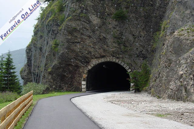 2. Dopo essersi lasciati alle spalle Terme di Brennero, si incontra la prima delle due gallerie presenti nella tratta fino a Moncucco. La pista ciclabile è da un lato asfaltata e dall'altro sterrata e ricoperta di ghiaino (nell'immagine i lavori erano ancora in fase di ultimazione). Da notare le reti che proteggono la pista ciclabile dalla caduta di massi. (Foto Fabio Veronesi, 11 luglio 2010)