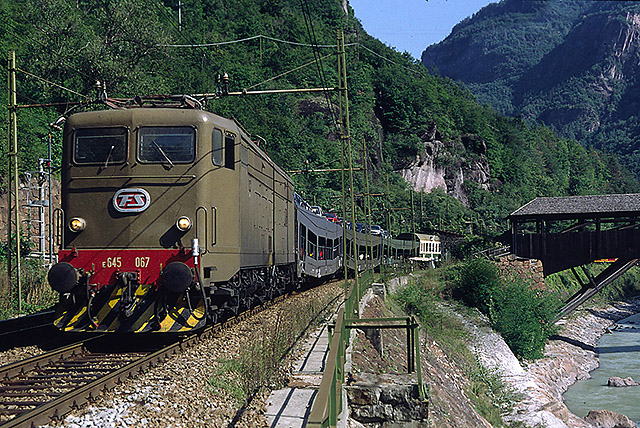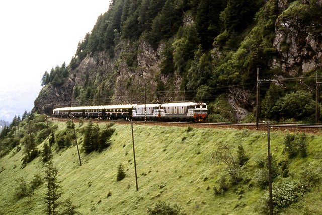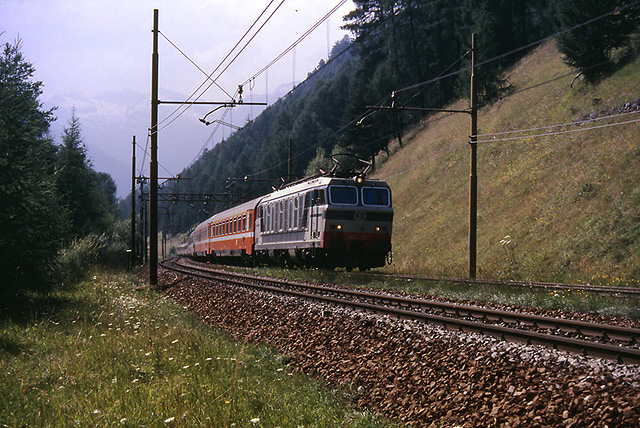 13. Un lungo convoglio internazionale, al traino della E.633.229, percorre la ripida salita lungo la Val di Fleres; ancora poche centinaia di metri e raggiungerà da Moncucco. La deviazione della ferrovia lungo la Val di Fleres (laterale della Val d'Isarco) si era resa necessaria all'epoca della costruzione della linea per superare il notevole dislivello tra Colle Isarco e Brennero mantenendo la pendenza entro limiti accettabili. (Foto Franco Pepe, 24 luglio 1988)